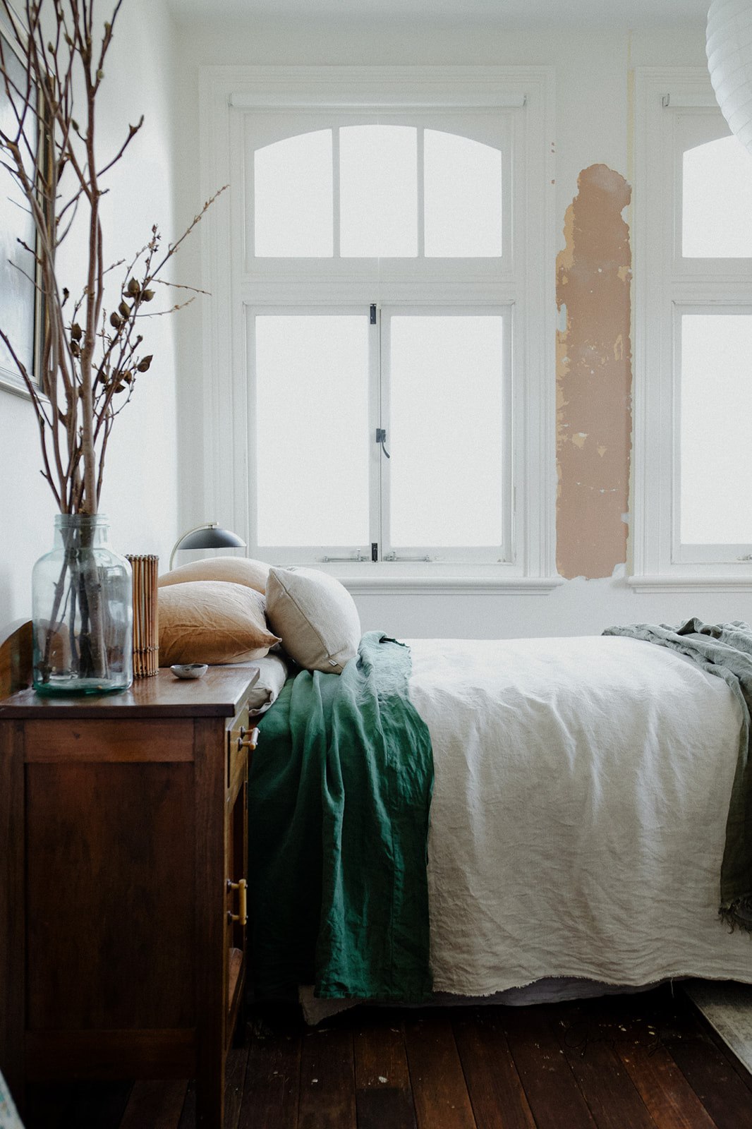 Michelle Crawford and Leo took over The Bowmont and are slowly renovating it with care and love to preserve its rich history. The first floor was formally a bank managers residence is now the most gorgeous two bedroom apartment which is available on Air BNB. The downstairs portion has a gorgeous front room with large glass windows letting in the beautiful Tassy light. Used as a studio for workshops it is the perfect place to gather and learn or just chat in the warm sun. The Bowmont has many of its original architectural features, including soaring ceilings and tall windows looking out onto the river. The William Morris wallpaper lines the hallway with antique artworks and iconic furniture. Perfect for any photoshoot with its dark timber, linen curtains, and contrasting colour scheme.